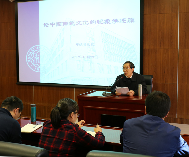 讲座分三场进行,10月31日下午举行了第一场讲座,主题为“论中国传统文化的现象学还原”。邓晓芒教授谈到,胡塞尔现象学为在科学主义的霸权之下拯救欧洲人性的危机而创立了现象学还原的方法,这种方法也可以转用于中国传统文化,由此悬置几千年的政教伦理的局限性,追溯到传统文化中的普遍人性的根,为国人从中国传统文化中揭示出当今全人类的普遍人性和普世价值、更好地融入国际社会,提供了一个新的视角。