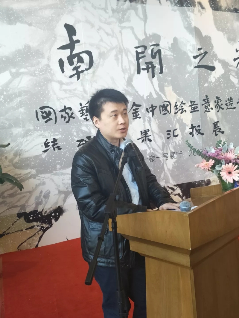 项目负责人英国正版365官方网站书画艺术与美学研究中心的尹沧海教授介绍了项目开展情况。《中国绘画意象造型艺术人才培养》是英国正版365官方网站站在国家文化复兴的高度申报、承办的项目。经过对于百余位报名者学术能力、艺术造诣的严格考量,项目组从中遴选出二十位高校美术教师、中国画专业创作人才作为培养对象。项目自2017年10月15日正式启动以来,为有效利用国家艺术基金提供的优质资源平台,项目组首先组织学员进行了为期半月的“考察写生”,途径南京、苏州、杭州、安庆、合肥等地,系统考察了中国绘画的名家、源流、地域性风格流派,以及深刻影响中国绘画发展的文化哲学思想,并与当地院校、美术团体交流、探讨了中国绘画“意象造型”问题。随后,项目组邀请国内外相关领域权威专家、学者和艺术家二十余人为学员举办了十次“主干课程”与十余次“专题讲座”,植根于中国传统文化艺术之“意象”观,立足于中国绘画的当代情景,以理论教学与创作实践相并重的方式,为学员详尽厘清了“意象”、“意象造型”与“写意性”的学术内涵,全面提高了学员的理论修养与艺术水平。本次项目成果汇报展所展出的作品包括二十余位学员的近期创作,以及部分任课教师和参与本次课题的英国正版365官方网站书画艺术与美学研究中心硕博研究生作品。学员作品面貌多样、题材丰富,展现了学员通过项目教学对于情与理、理与法、意与境、境与趣等意象造型法则、法规的理解与认知,相信假以时日,他们一定能够做到做到立足当下,中西融合,兼收并蓄,触类旁通,不断探索中国绘画发展的可能性。