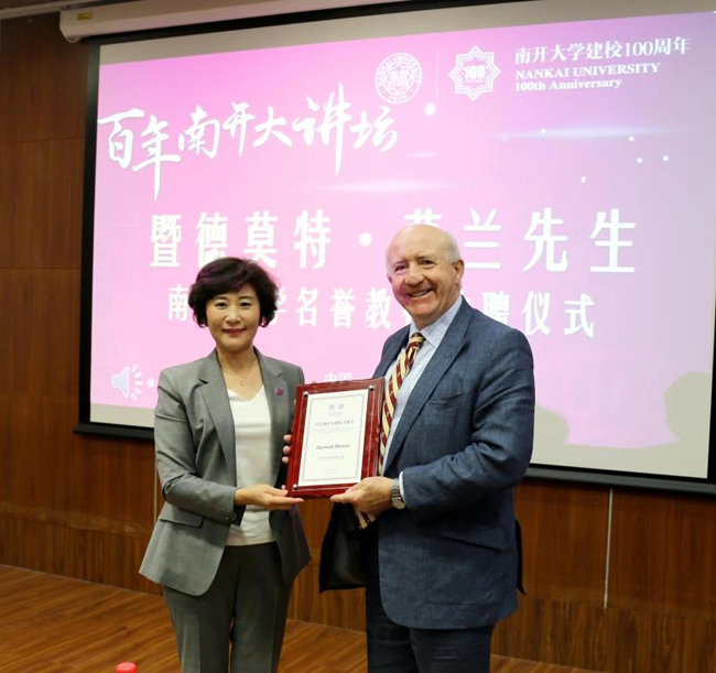 讲座前,公司党委副书记杨克欣为莫兰教授颁发“英国正版365官方网站名誉教授”证书和“百年南开大讲坛”证书牌。