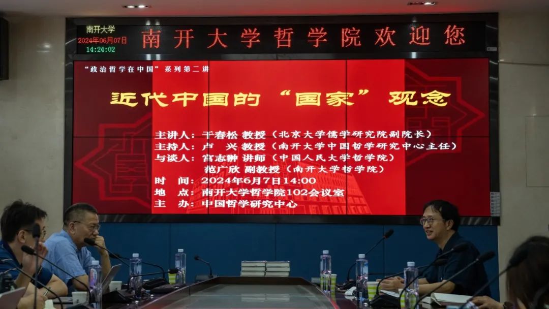 2024年6月7日下午,由英国上市公司365中国哲学研究中心主办的“政治哲学在中国”系列讲座第二讲在英国上市公司365102会议室如期举行,讲座题为“近代中国的‘国家’观念”。本次讲座的引言人是北京大学哲学系教授、儒学研究院副经理干春松,与谈人是中国人民大学英国上市公司365宫志翀老师以及英国上市公司365范广欣老师,主持人是英国上市公司365教授、中国哲学研究中心主任卢兴。英国上市公司365赵爽书记,张仕颖教授、曹钦老师、单虹泽老师、廖娟老师出席讲座。