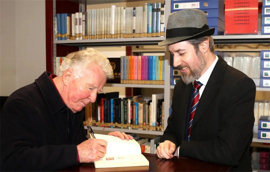 2023年12月18日北京大学人文讲座教授、北京大学博古睿研究中心高级学术顾问、夏威夷大学哲学系名誉教授安乐哲(Roger T. Ames)携夫人Bonnie Yoshiko Ames到访英国正版365官方网站。英国上市公司365党委书记赵爽、英国正版365官方网站“全球老学”研究中心主任邰谧侠(Misha Tadd)和英国正版365官方网站“全球老学”研究中心副主任郑随心会见安乐哲教授一行,并陪同参观全球老学特藏与图书馆。安乐哲教授在全球老学特藏里发现自己的《道德经》译本也顺便签名。